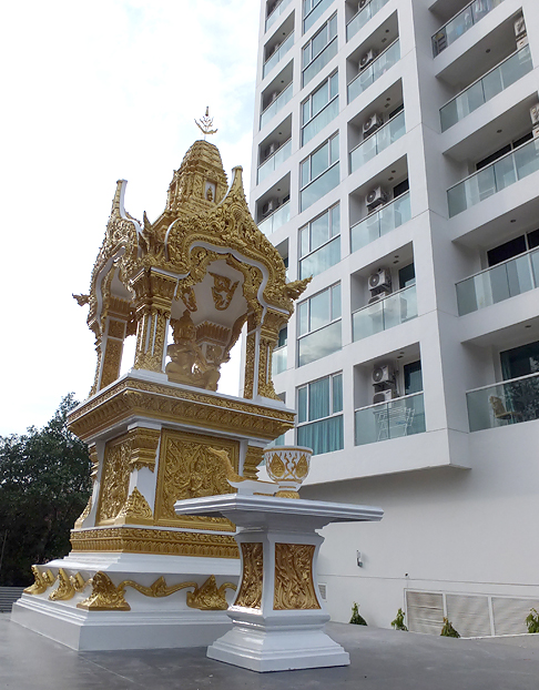 | สถานที่ : หอพัก Peeraphan Place ตรงข้าม ม.ธุรกิจบัณฑิตย์ ถ.ประชาชื่น นนทบุรี ประเภทศาล : ศาลพระภูมิและศาลเจ้าที่ทรงโมเดิร์นใหญ่ หลังคาลายร่อง สีขาวมุกลายทอง |
