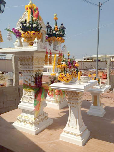 | สถานที่ : โรงงานสิ่งทอของคุณชวลิต ประเทศพม่า ประเภทศาล : ศาลพระพรหม 12 นิ้ว เกรดเอ สีขาวลายทอง ศาลเจ้าที่สามมุขใหญ่ สีขาวลายทอง |