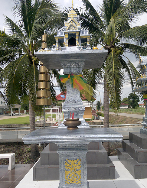 | สถานที่ : บริษัท เอส.พี. สมศรี จำกัด 71 ม.11 ต.ตาลเดี่ยว อ.แก่งคอย จ.สระบุรี ประเภทศาล : ศาลพระภูมิทรงหลายเสา เสาลายพญาหงส์ สีน้ำตาลลูไซท์ สีเหลือง สีแดง เขียนลายเส้นทอง |