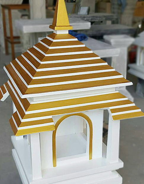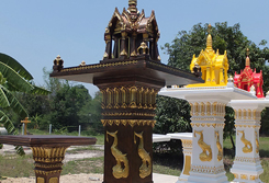 สถานที่ : ดำเนินพวา รีสอร์ทบ้านต้นไม้ สมุทรสงคราม ประเภทศาล : ศาลพระพรหม 12-14 นิ้ว ทรงบุษบกลายใหม่ สีขาวทาทองทึบ ศาลเจ้าที่สามมุขใหญ่ |