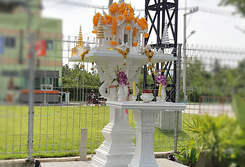 | สถานที่ : สำนักงานโครงการปรับปรุงด่านเก็บเงินค่าธรรมเนียมผ่านทางธัญบุรี Motorway ถ.ลำลูกกา ปทุมธานี ประเภท : ศาลพระภูมิทรงบางปะอินเล็กเสานาคสีขาวทองทึบ ศาลเจ้าที่ทรงสามมุขใหญ่ |